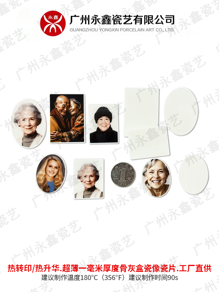 同時廣州永鑫瓷藝有限公司還在低溫瓷像制作領(lǐng)域處于行業(yè)的絕對領(lǐng)先地位:專注低溫瓷像機(jī),低溫瓷像瓷片(熱轉(zhuǎn)印瓷片/熱升華瓷片)全球供應(yīng)商(全球規(guī)格最全),低溫瓷像制作無需高溫?zé)疲苯訃娪〕尚停僮骱喴住?